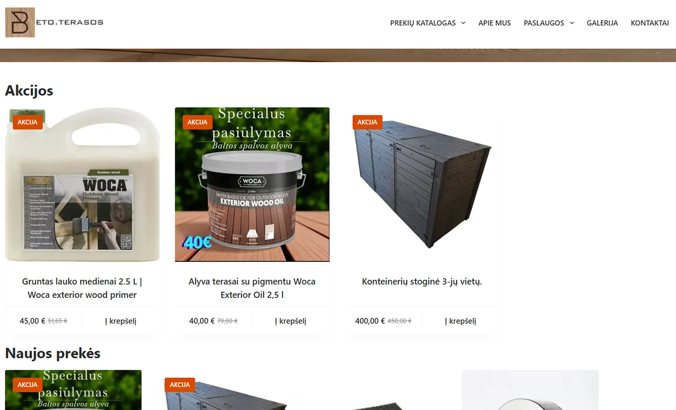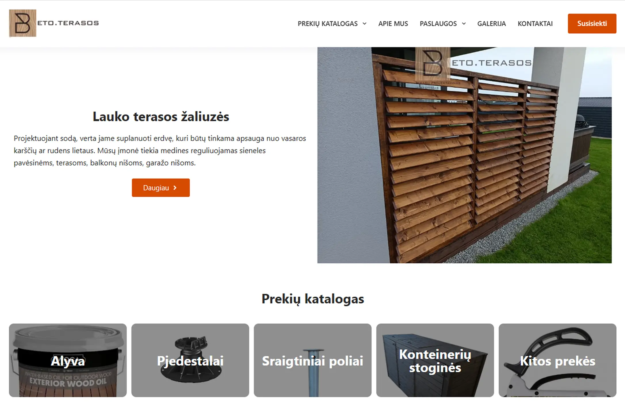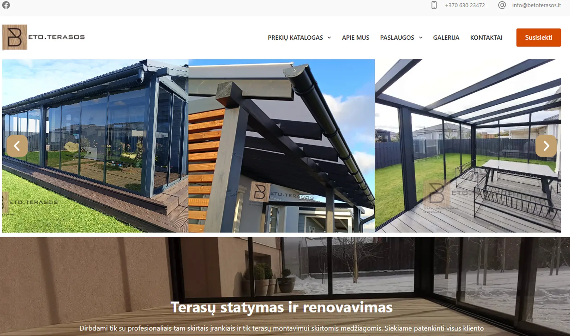 Viršutinėje juostoje padidintas matomumas – ryškesnis tekstas ir mygtukai, kad vartotojai lengvai rastų pagrindines nuorodas. Meniu skiltyje pridėtas „Susisiekti“ mygtukas, nukreipiantis tiesiai į kontaktų puslapį. Pagrindiniame puslapyje įtrauktas slankiojančios galerijos blokas, leidžiantis vartotojams patogiai peržiūrėti nuotraukas. Išdėstyti keturi paslaugų blokai: „Stiklinės verandos“, „Stiklinės stoginės“, „Medinės stoginės“ ir „Terasos grindys“, kurių kiekviena paslauga trumpai aprašoma su nuoroda į detalesnį puslapį. Prekių katalogas pateiktas vienoje juostoje, kur kategorijos rodomos blokais, o paskutinis mygtukas nukreipia į kontaktų puslapį.