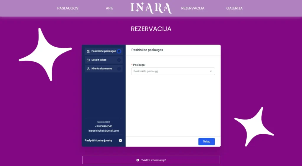 Didelis dėmesys skirtas rezervacijos funkcionalumui, kuris buvo vienas pagrindinių kliento lūkesčių. Papildomam vizualiniam išskirtinumui sukurta animuota žvaigždučių grafika, suteikianti svetainei gyvumo ir estetikos.